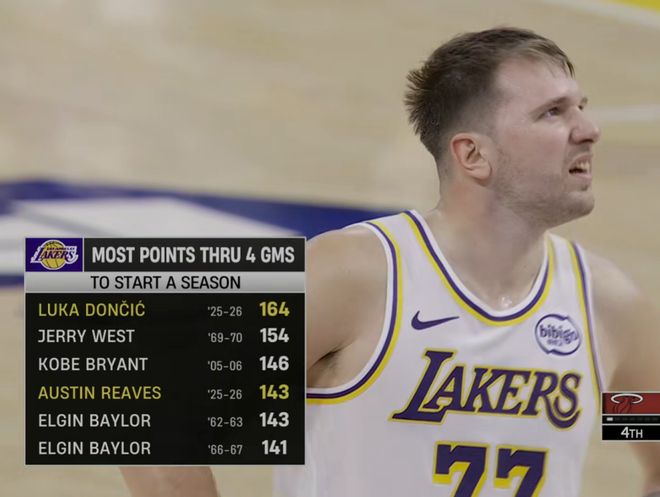 东契奇和里夫斯前四场分别得165和143分,位列队史第一和第四